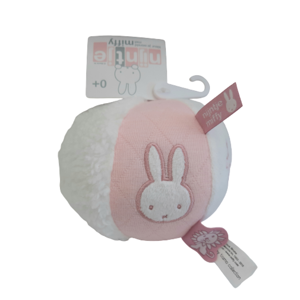 Bal gemaakt van zachte materialen. Beschikt over een rammeltje en verschillende kleuren en afbeeldingen.