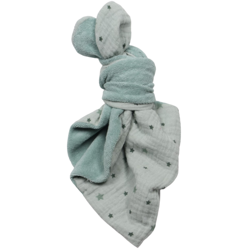 Knuffel die met de hand gemaakt is en die je gemakkelijk in een konijntje kunt knopen. De stof is van hydrofiel met badstof en tricot stof. Wasbaar tot 30 graden.