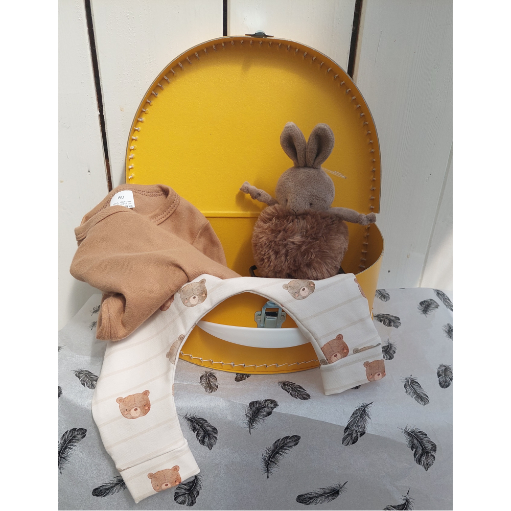 Dit cadeau pakketje is samengesteld voor een lief jongetje of meisje. Wil je iemand verrassen! Bestel dan dit leuke pakket, en ik zorg dat het heel feestelijk voor je wordt ingepakt. Wil je er een kaartje bij voegen? Kijk dan onder het thema kraamcadeau en zoek een leuk kaartje bij. Geef aan mij de tekst door, dan zorg ik dat het op het kaartje komt. Ik kan en wil het eventueel als de kersverse ouders niet in de buurt wonen het ook voor jullie versturen!