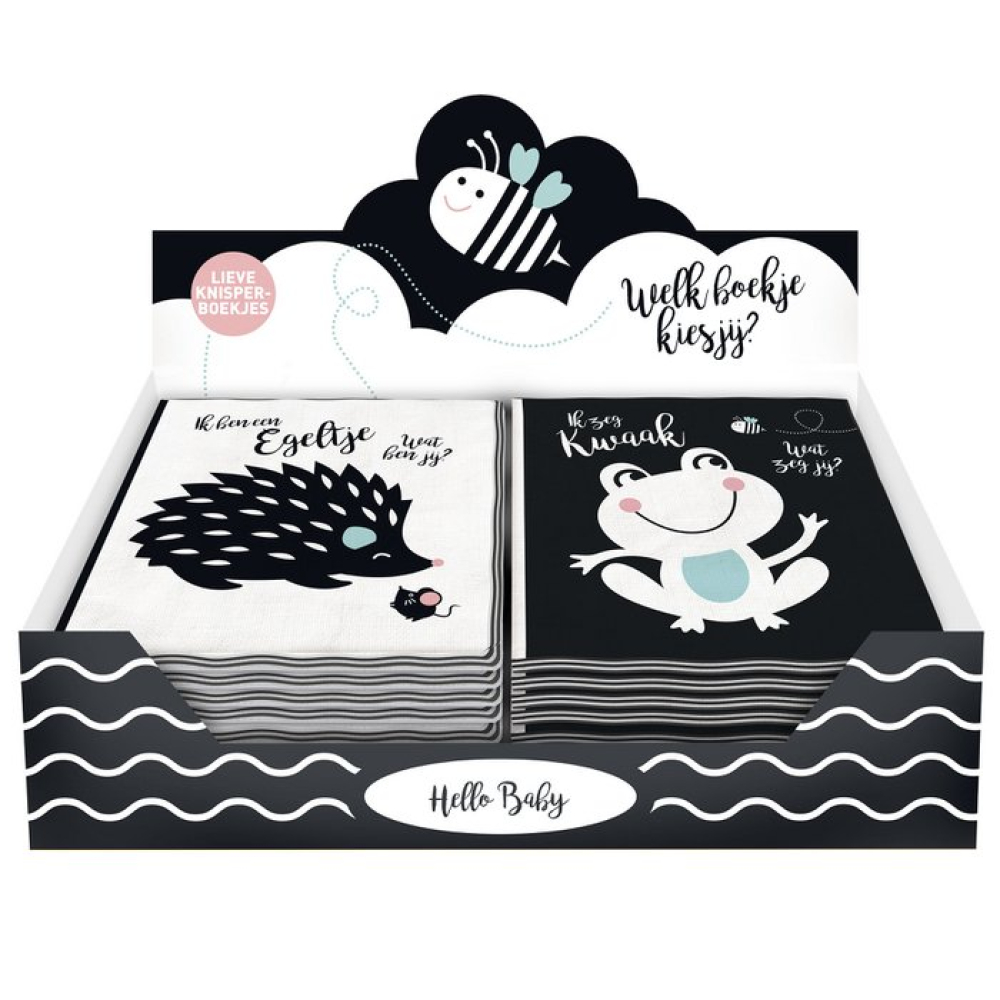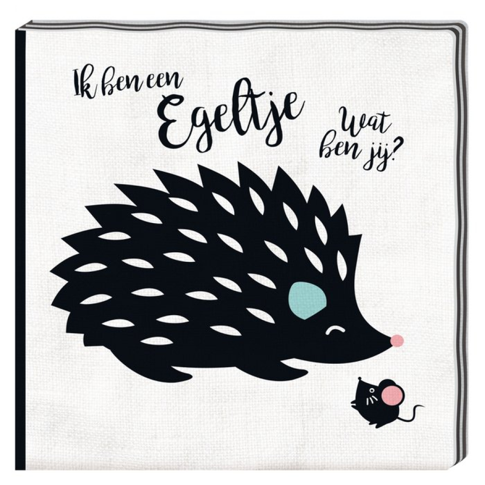Stoffen babyboekje met twee knisperpagina's. waarvan de afbeeldingen zijn uitgevoerd in zwart-wit. met enkele details in steunkleuren blauw en roze. Naast pagina's met gestileerd weergegeven dieren (een walvis. een kat. een bij. en voorop een egel en een muis) staan pagina's met eenvoudige. zich herhalende patronen (golven. huisjes. wolken en achterop boompjes). In de tekst noemen enkele dieren zichzelf bij de naam. bijvoorbeeld "Ik ben een walvis'. Er is gebruikgemaakt van semi-schrijfletters. Baby's houden vaak van contrasterende zwart-witte afbeeldingen. De grafische patronen zullen de aandacht vasthouden. De zachte stof voelt prettig aan en nodigt uit tot friemelen en ontdekken. Een boekje dat een bijdrage kan leveren aan de visuele ontwikkeling en de ontwikkeling van de tastzin. En geschikt om het fenomeen boekje te leren ontdekken. In dezelfde uitvoering verscheen ook 'Ik zeg kwaak : wat zeg jij?'*. Aantrekkelijk uitgave voor baby's vanaf ca. 3 maanden