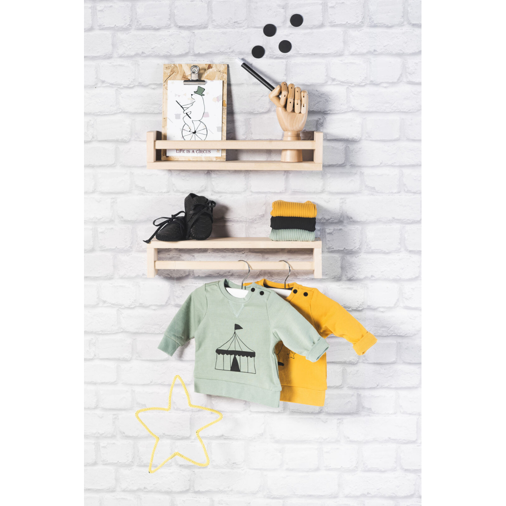 Erg leuke sweater uit de Circus collectie van Jollein. Op de okergele sweater is een konijntje in een hoed afgebeeld en op de groene sweater zie je een circustent. De verkrijgbare maten zijn 50/56, 62,68 en 74/80 en het shirtje is gemaakt van biologisch french terry katoen.